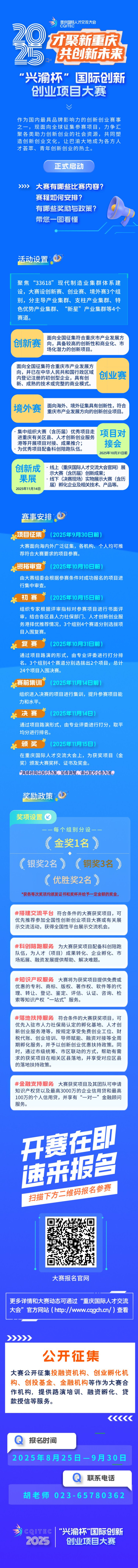 9月1日,重庆市人力社保局发布消息,2025“兴渝杯”国际创新创业项目大赛正式启幕,大赛将聚焦重庆市“33618”现代制造业集群体系建设,设创新赛、创业赛、境外赛3个组别,设主导产业集群、支柱产业集群、特色优势产业集群等赛道,即日起至9月30日前,面向海内外广泛征集项目,各机构、个人均可推荐符合大赛要求的项目参赛,获奖项目将获得奖金、最高100万元个人信用贷款等。